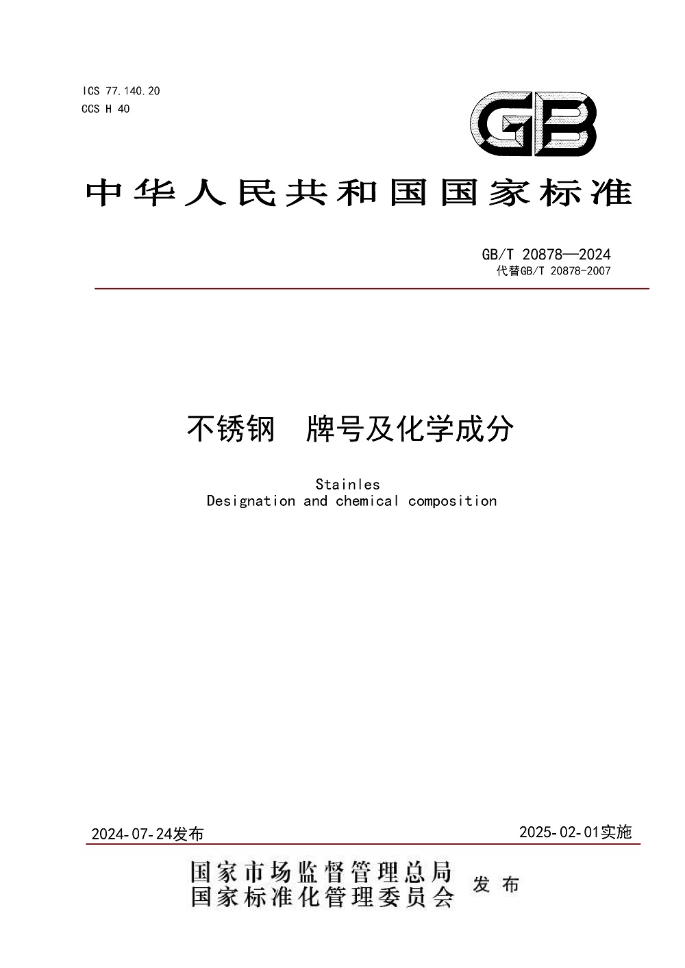 近日,由冶金工业信息标准研究院主编、福建青拓特钢技术研究有限公司等单位参编的国家标准GB/T 20878-2024《不锈钢 牌号及化学成分》发布,于2025年2月1日起实施。