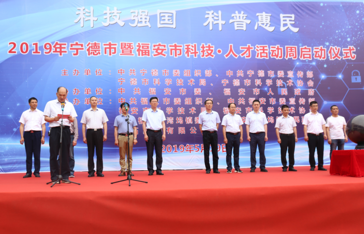 5月19日,由中共宁德市委组织部、宣传部、宁德市科学技术局、科学技术协会主办,中共福安市委、福安市人民政府协办的2019年宁德市暨福安市科技•人才活动周启动仪式在青拓集团有限公司万人生活区举行。宁德市政府、市直有关部门和福安市政府、市直有关部门、湾坞镇政府、青拓集团领导,以及科技工作者、企业员工、群众代表等300多人参加仪式。宁德市政府副秘书长黄海峰、福安市政府副市长谢嘉林在启动仪式上分别致辞,宁德市科技局党组书记、局长陈茂榕主持启动仪式。