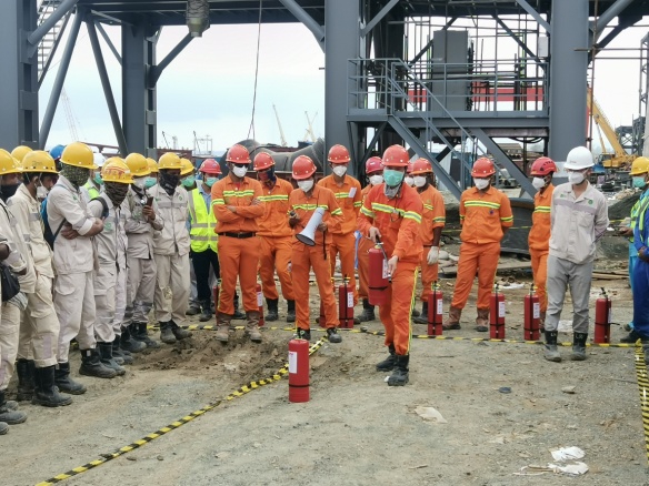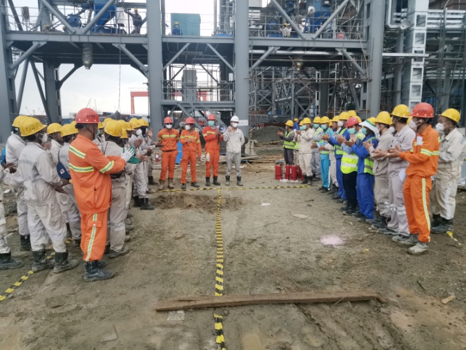 4月3日16时,印尼纬达贝工业园区8*250MW火力发电厂1号机组施工现场,一场中印尼员工联合消防演练正在上演。本次演练由安环部组织,都市环保总包单位和发电事业部中印尼员工参加,主要包括消防知识宣贯、手提式灭火器实战灭火、消防水带实战灭火等演练内容。